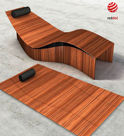 eine flache rollbare matte, die zusammengefaltet zu einer sich selbst stabilisierenden, ergonomischen liege wird