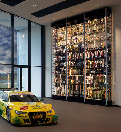 Glasvitrine für Motorsport-Siegerpokale von Audi Sport in Neuburg