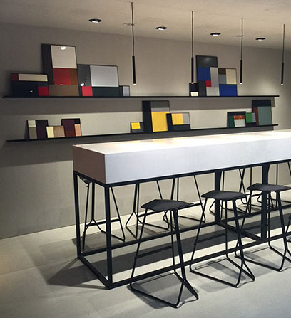 Lackmusterelemente und Aufbewahrungssystem in Schauraummöbel für Händler, Gestaltung und Produktion