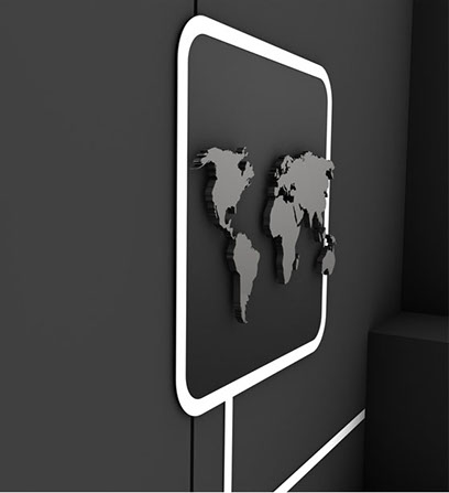 Die neun Ortsteile Großmehrings wurden in einer 5 x 6 Meter großen Wandinstallation als eine Art Landkarte angebracht. Die prägende Installation aus hellgold eloxiertem Aluminium spiegelt die Materialität und den Architekturstil des modernen Baus wieder.
