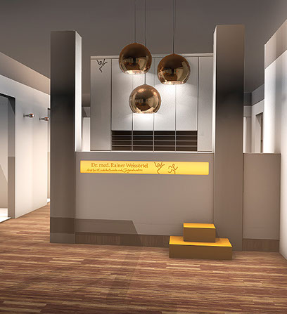 Raumplanung, Möbel, Einrichtung, Beschriftungen, Erscheinungsbild, Logo, Geschäftsausstattung und Printmedien für Kinderarztpraxis Dr. med. Weissörtel – inzwischen Dr. med. Ursula Schwaiger & Ulrike Porz – in Neuburg/Do.
