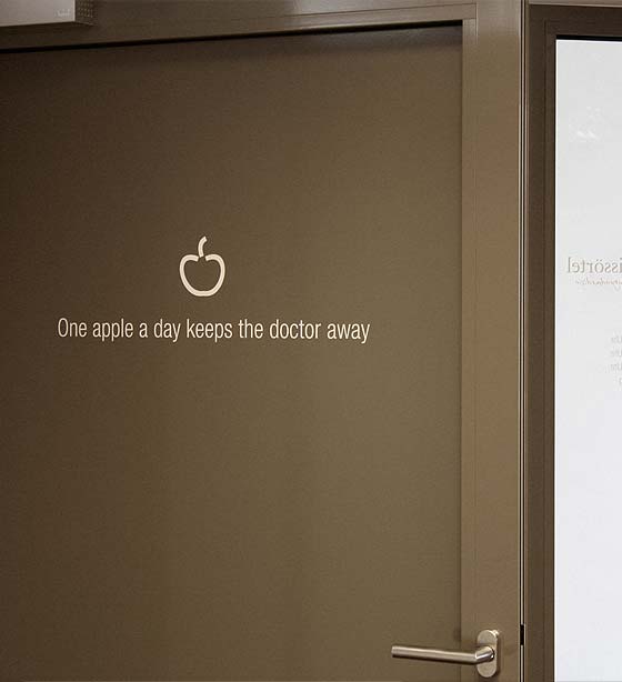 Um allen Besuchern – Kindern, Jugendlichen und Erwachsenen – gerecht zu werden, wurde die Praxis farblich reduziert und konsequent in Weiß, Grau und Orange als freundliche Akzentfarbe gestaltet. Für die kleinen Patienten sind überall in der Praxis kleine Strichmännchen unterwegs. Sie hängen an Leuchten, sitzen auf Schaltern, balancieren auf Fussbodenleisten oder halten die Beschriftungen der Räume an den Türen fest. Spielzeug sind neben Büchern, Bauklötze aus ungefärbtem Naturholz und Legosteine in den Farben Weiß, Grau und Orange.