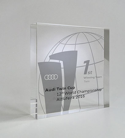 Siegerpokal des internationalen Audi Twin Cup aus Acryl und Aluminium, Konzept/Design/Produktion