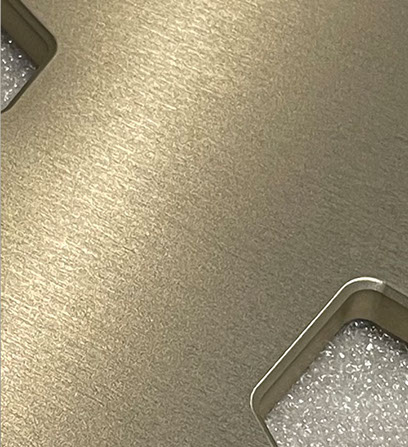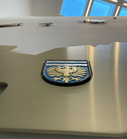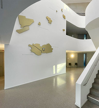Die neun Ortsteile Großmehrings wurden in einer 5 x 6 Meter großen Wandinstallation als eine Art Landkarte angebracht. Die prägende Installation aus hellgold eloxiertem Aluminium spiegelt die Materialität und den Architekturstil des modernen Baus wieder.