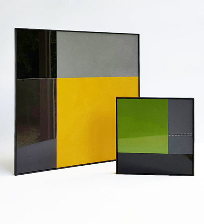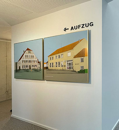 Links davon befinden sich zwei im Pop-Art-Stil, mit aufwendigem 20-farbigen Siebdruck hergestellten Grafiken, welche die ehemals an diesem Ort stehenden Gebäude der Familie Schneider zeigen.