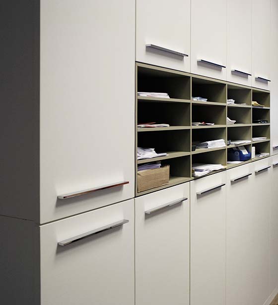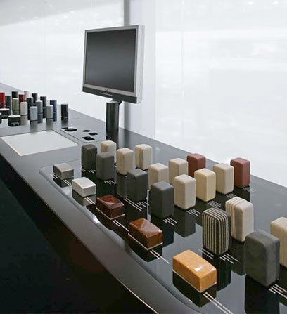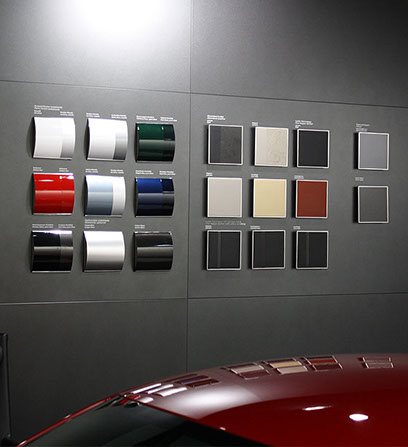 Lackmusterelemente und Aufbewahrungssystem in Schauraummöbel für Händler, Gestaltung und Produktion