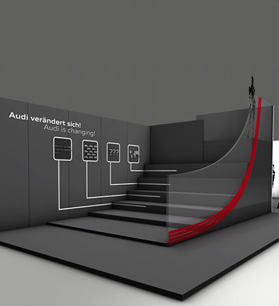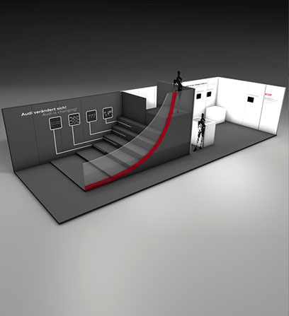 Messestand für Audi Präsentation, Konzept, Planung, 3D-Visualisierung, Grafikerstellung, Montage