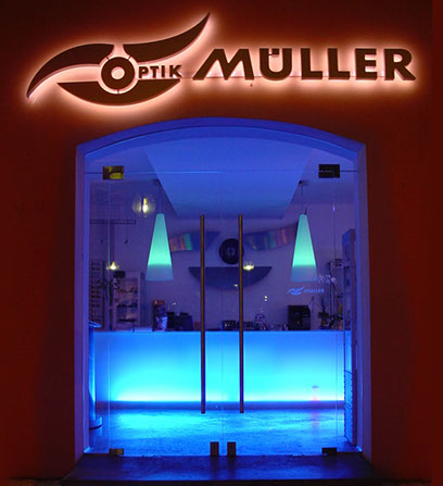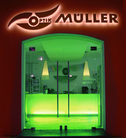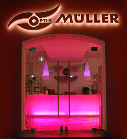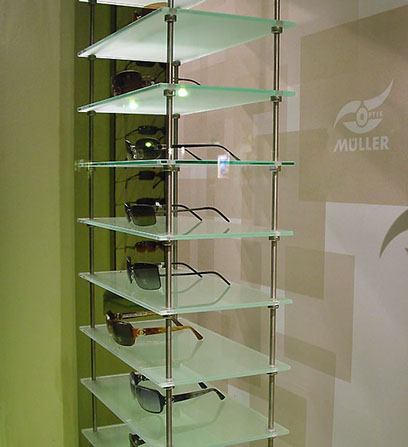 Ladeneinrichtung, Gestaltung von Sitzmöbeln, Tischen, Theke, Leuchten, Präsentationsregalen im Verkaufsraum und Schaufensterbereich für Brillenladen