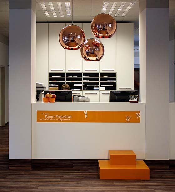 Raumplanung, Möbel, Einrichtung, Beschriftungen, Erscheinungsbild, Logo, Geschäftsausstattung und Printmedien für Kinderarztpraxis Dr. med. Weissörtel – inzwischen Dr. med. Ursula Schwaiger & Ulrike Porz – in Neuburg/Do.